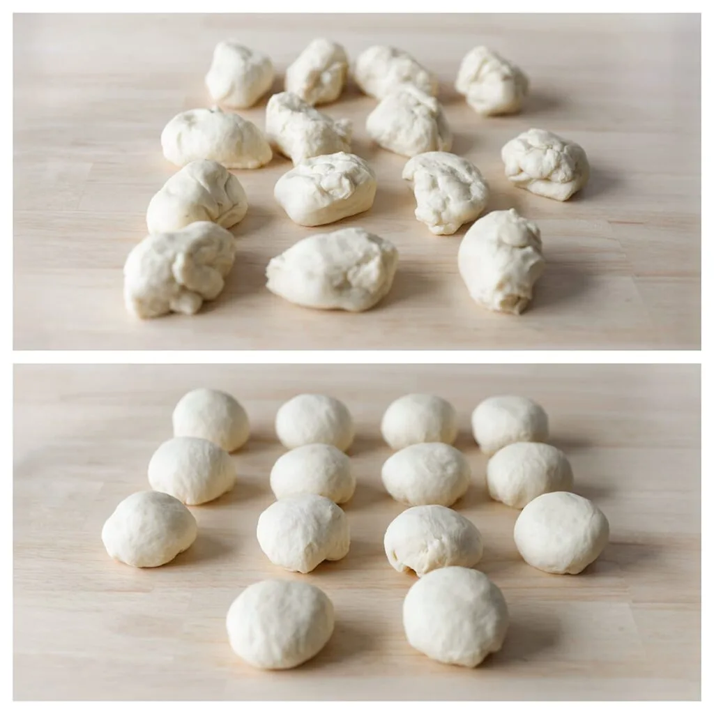 Deflate the dough down and divide it into 14 equal pieces, approximately 70 g each. Shape into balls.