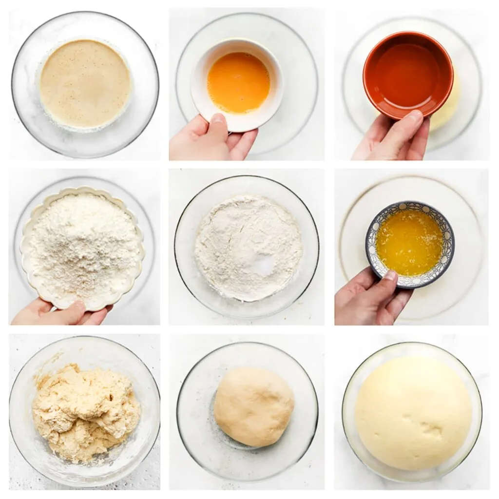 Add the beaten egg and sunflower oil. Mix well. Then add the flour, salt, and butter. Knead the dough for 10-12 minutes until smooth. Cover the dough and let it rise for 1 hour in a warm spot or until doubled in size.