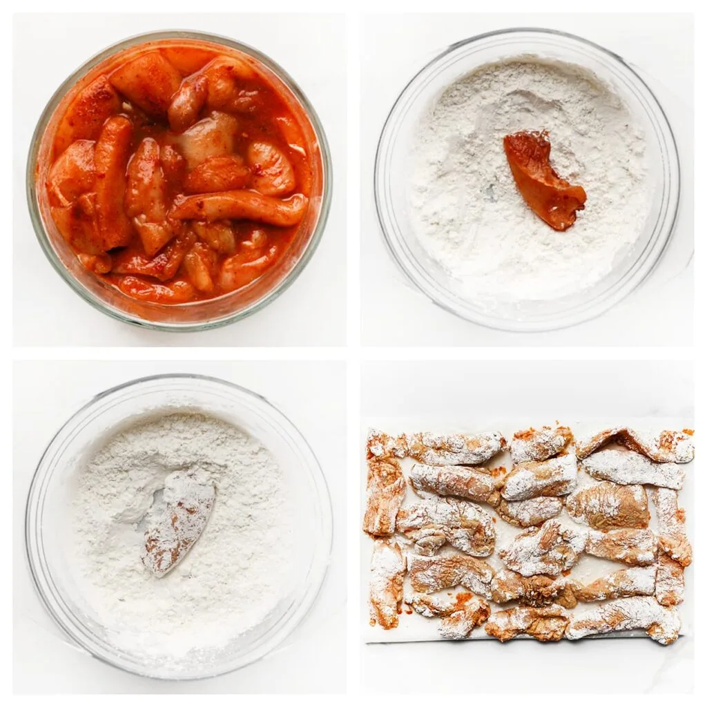 | Coat the chicken thoroughly with the cornstarch mixture. Place on a sheet of parchment paper. |