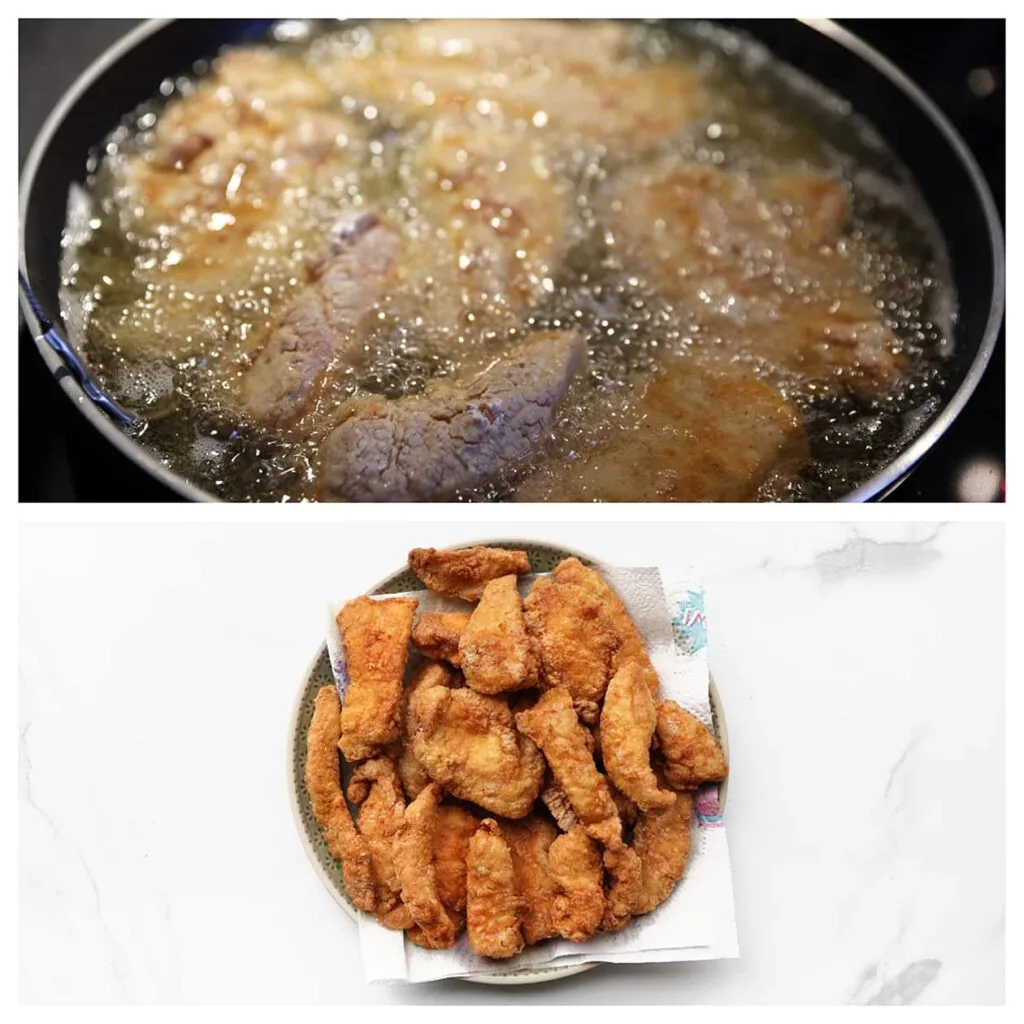 | Heat a thin layer of sunflower oil in a skillet over medium heat (175 ℃, 350 °F). Fry the chicken until golden brown and drain on paper towels. |